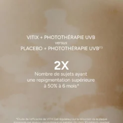 Peut-on utiliser Vitix sans photothérapie ? Oui, Vitix Gel peut s’utiliser seul, mais les études montrent que son efficacité est considérablement amplifiée lorsqu’il est associé à une exposition UV contrôlée.