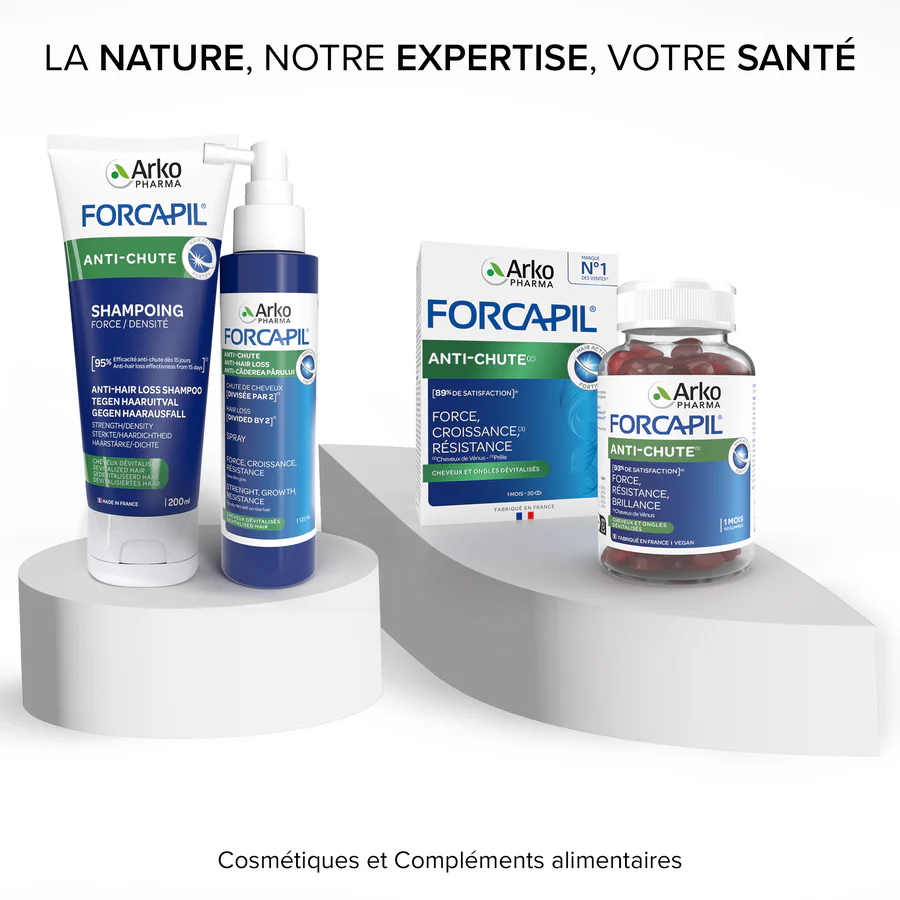 Arkopharma Forcapil Anti-Chute Lot 90 Comprimés est la solution complète anti-chute des laboratoires Arkopharma pour un programme de 3 mois (2 mois + 1 mois offert). Sa formule innovante associe acides aminés soufrés, extraits de plantes spécifiques et un complexe complet de vitamines et minéraux pour agir sur les trois étapes du cycle capillaire : freiner la chute, stimuler la pousse et renforcer la résistance.