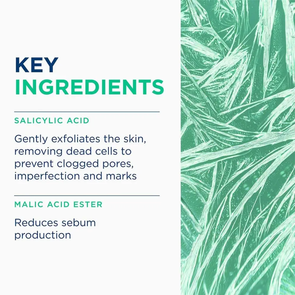 Le duo exclusif d’actifs kératolytiques combine acide salicylique et ester d’acide malique, efficaces au pH physiologique de la peau pour éliminer les imperfections en surface et en profondeur. L’ester d’acide malique à double action aide à réguler l’excès de sébum. Le brevet FLUIDACTIV™ normalise biologiquement la qualité du sébum pour prévenir les récidives. Formule enrichie en agents hydratants pour maintenir le confort cutané. Composition clean sans parabènes, testée sous contrôle dermatologique.