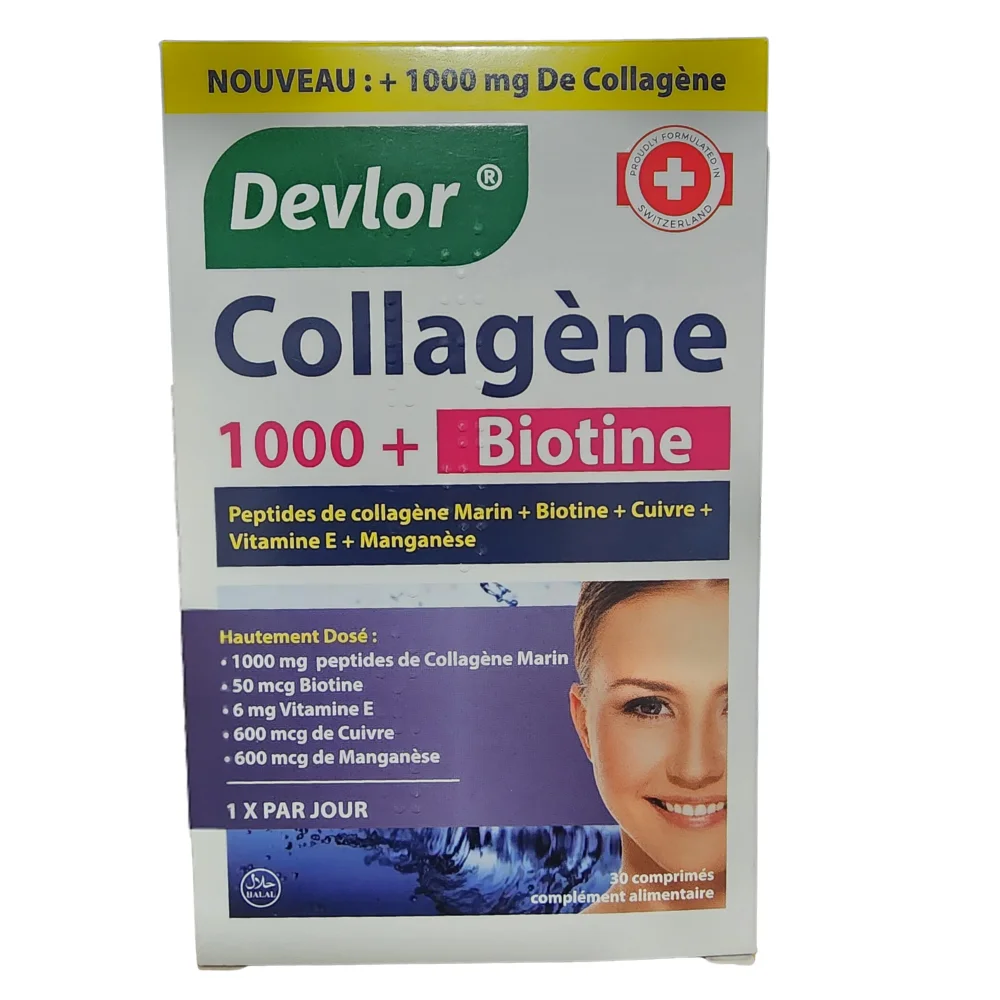 Marque : Devlor (Nutraxin) | Format : 30 comprimés | Collagène hydrolysé 1000 mg | Biotine (Vit. B7) | 1 comprimé/jour | Action : Peau + Cheveux + Ongles | Anti-âge